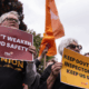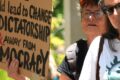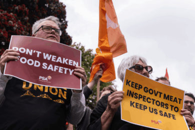 A protest against the plan for meat inspection privatisation took place outside Parliament. Photo: RNZ / Samuel...