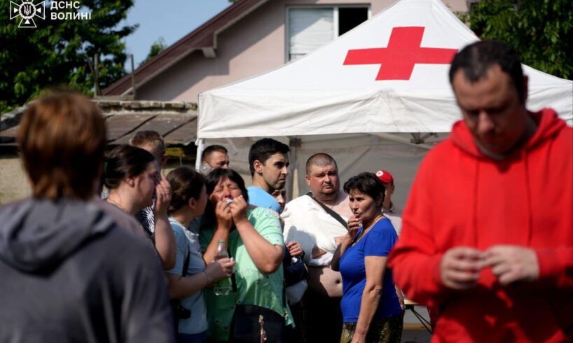 People gather at an aid station in Lutsk after a mass Russian attack on June 6 (State Emergency Service/Facebook)
