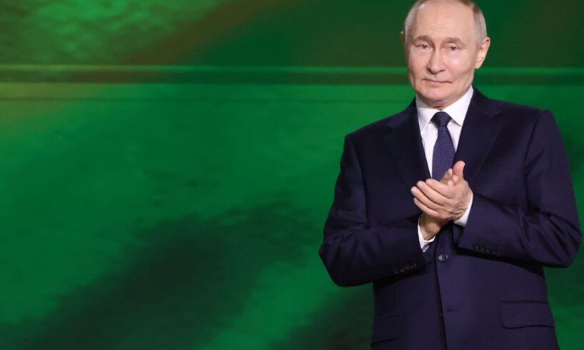 Russian President Vladimir Putin applauds during the ‘All For The Victory’ forum, which promotes victory over Ukraine, on July 6, 2025 in Moscow, Russia. The event is hosted by People’s United Front, a pro-Kremlin organization. (Contributor/Getty Images)