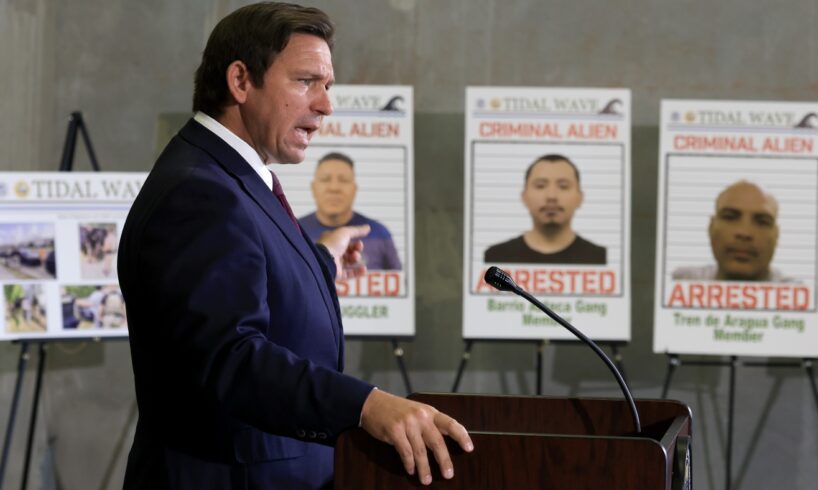 Florida Gov. Ron DeSantis speaks during a press conference, in front of posters of people that law enforcement arrested. DeSantis talked about a multi-agency immigration enforcement effort named Operation Tidal Wave that they say resulted in more than 1,100 arrests in a single week in Florida.
