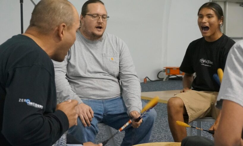 Then they lined up and a relative tied a feather — traditionally on the left side, the heart’s side — as tribal members sang and drummed to celebrate them.