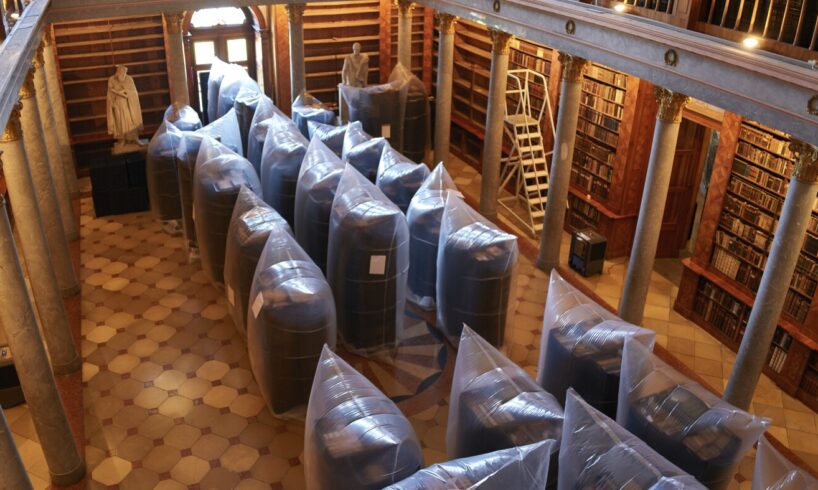 This photo provided by Pannonhalma Archabbey shows books kept in hermetically sealed plastic sacks for disinfection at the Pannonhalma Archabbey’s library in Pannonhalma, Hungary on July 3 as a beetle infestation threatens its ancient collection.