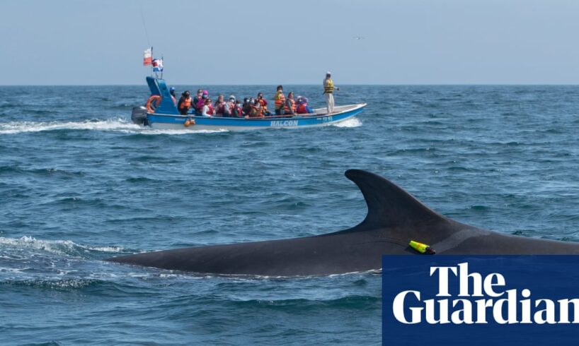 Once attached to a whale, the tag will stay on its body for up to 30 hours. Photograph: Francis Pérez/The Guardian