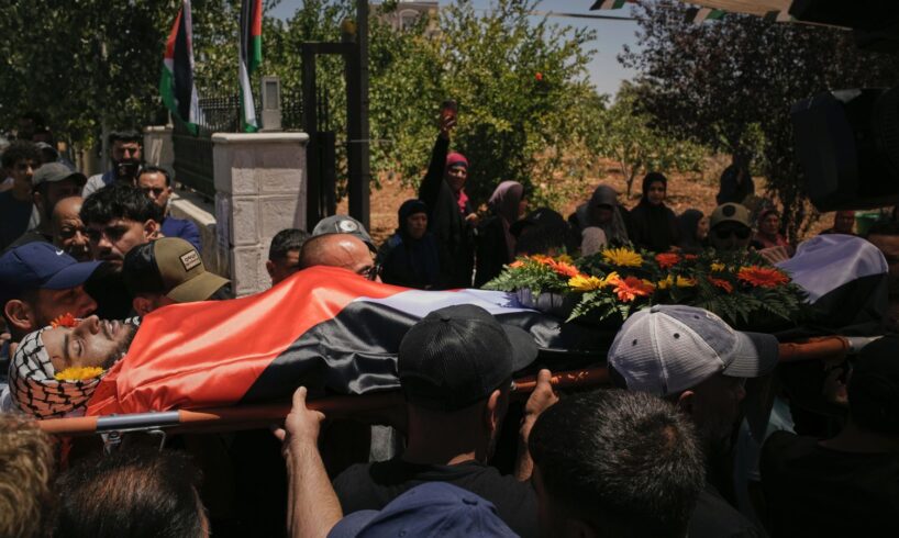 Mourners carry the body of Palestinian-American Sayfollah Musallet, 20, during his funeral in the West Bank village of Al-Mazraa a-Sharqiya on Sunday, July 13, 2025. Musallet was murdered by Israeli settlers. [AP Photo/Leo Correa]