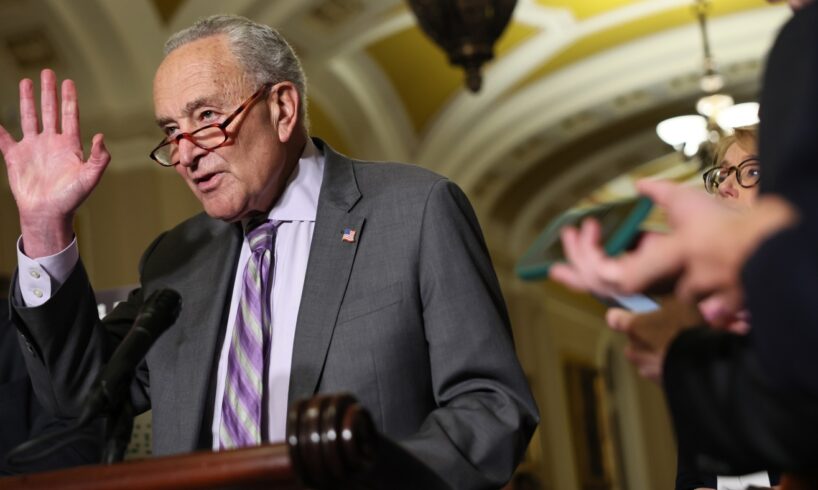 Senate Minority Leader Chuck Schumer, D-N.Y., arrives to speak with reporters about Senate Republicans’ efforts to claw back $1.1 billion of funding authority from the Corporation for Public Broadcasting and about $8.3 billion from foreign aid programs targeted by DOGE, at the Capitol in Washington, Tuesday, July 15, 2025.