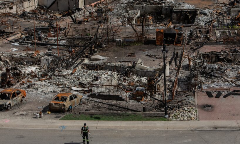 A worker walks in a neighbourhood devastated by wildfire in west Jasper on Aug. 19, 2024.AMBER BRACKEN/The Canadian Press