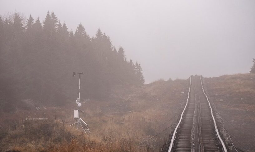 Fog blankets the upper section of the Mount Washington Cog Railway near the summit in Sargent’s Purchase, N.H. (Gregory Rec/Portland Press Herald via Getty Images)