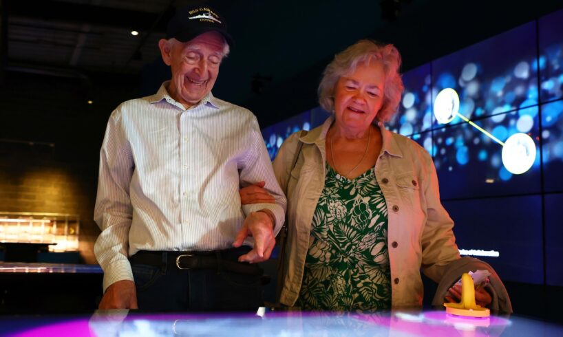Moments like this are what brought the Cirasundas to the comedy museum in western New York and the memory cafe taking place inside. The monthly events invite people with Alzheimer’s, dementia, or other memory loss, and their caregivers, to spend time at the interactive museum. For visitors like Mario, who has dementia, and his wife, the scenes and artifacts from funny shows and comedians have a way of triggering shared laughs and connection, and, as comedy center staff have found, memories.