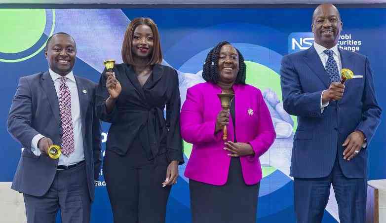 From left: Nairobi Securities Exchange (NSE) CEO Frank Mwiti, NSE EmpowerHER Lead Demi Murila, Chief of Staff in the Office of the First Lady Mary Muinde and NSE Chairman Kiprono Kittony ring the bell to launch the NSE EmpowerHER Patron’s Circle in May 2025. [Jenipher Wachie, Standard]
