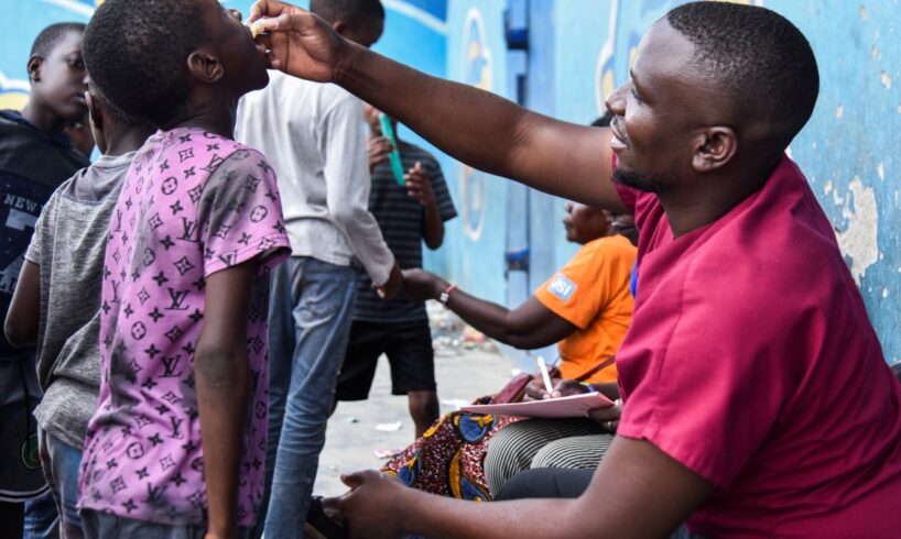 A child receives a cholera vaccine at a temporary treatment center during a past outbreak in Lusaka, Zambia.