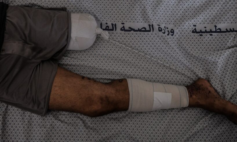 My father and I visited him at Al-Aqsa Hospital to check on him. At the gate of the hospital, a child greeted us; he was selling water in a plastic bag, holding it with one hand; his other hand was amputated. Inside, the scene at the ward where Osama was admitted was gut-wrenching. Dozens of amputees were lying on beds and on the floor.
