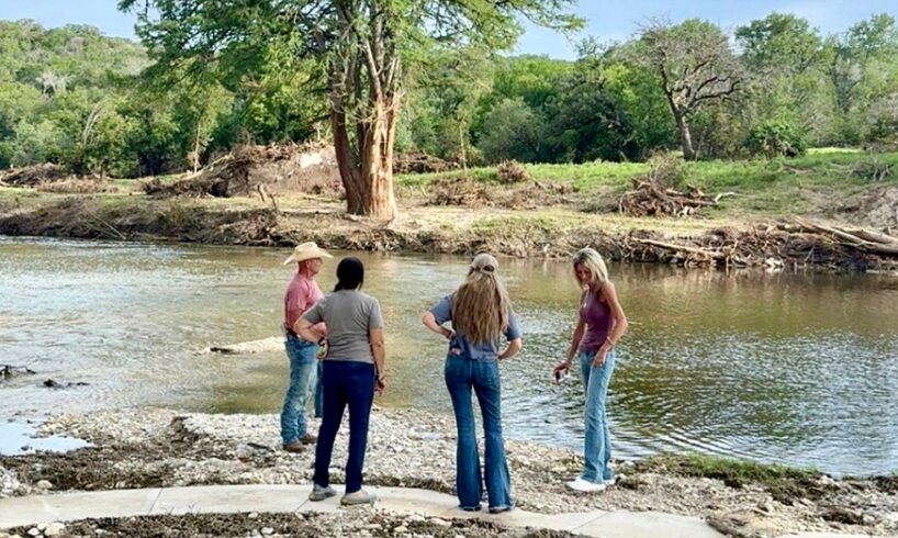 Janice Riley, Michelle Annette, and Lisa Aguillen join Bud Bolton in surveying damage in Kerrville, TX in July 2025. (Fox News Digital/Sophia Leone)