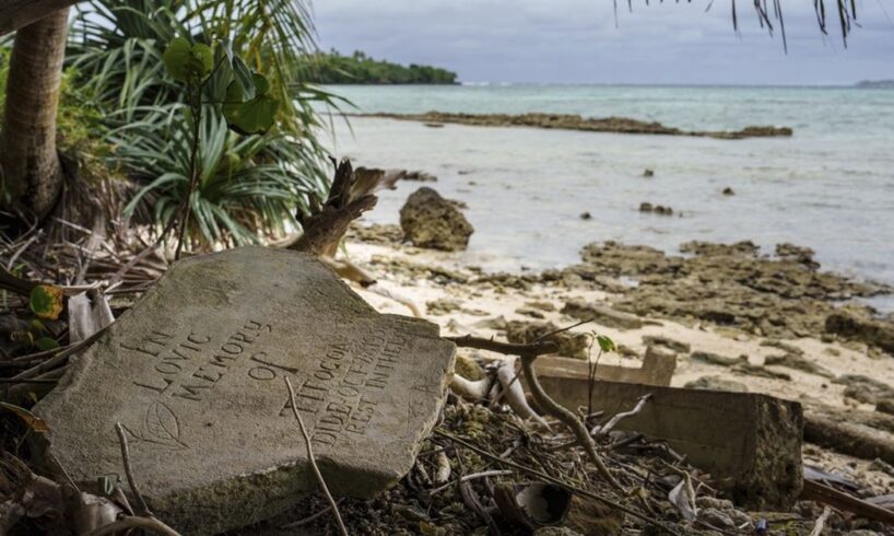 A gravestone lies just metres from the shoreline on Pele Island, Vanuatu, Friday, July 18, 2025. (AP Photo/Annika Hammerschlag)