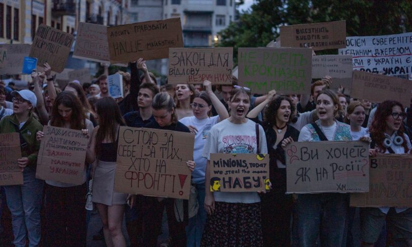 Many protesters carried signs reading “Veto the law,” “Protect the anti-corruption system, protect Ukraine’s future,” or simply “We are against it.”