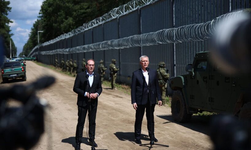 German Interior Minister Alexander Dobrindt and Poland’s Tomasz Siemoniak in front of the Polish border fence with Belarus [Photo by MSWiA_GOV_PL]