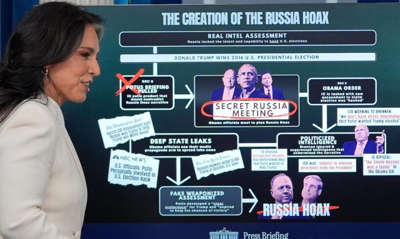Escalating her attempts to undermine the long-settled conclusion that Russia tried to help Trump beat Hillary Clinton for the presidency nearly a decade ago, she unspooled what she called unshakable proof that then-President Barack Obama and his advisers plotted nothing short of a coup.