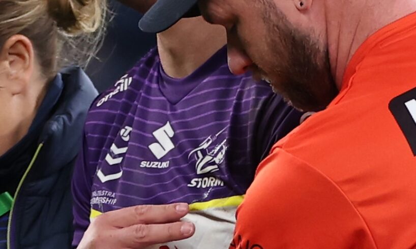 Melbourne’s premiership hopes have taken a seismic hit after Jahrome Hughes dislocated his shoulder in a gutsy 34-30 win over the Sydney Roosters.