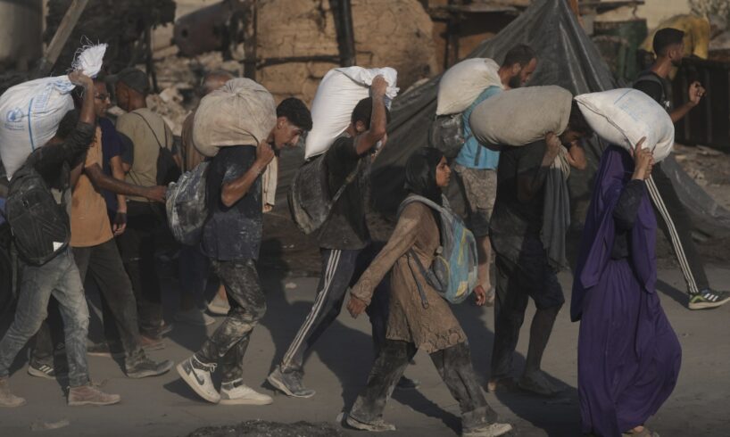 Palestinians carry sacks of flour unloaded from a humanitarian aid convoy that reached Gaza City from the northern Gaza Strip on Saturday, July 26, 2025.