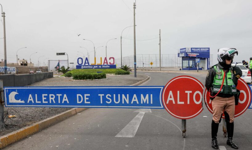 A Peru’s traffic police officer sets up a roadblock during a tsunami warning in La Punta, Callao province, Peru on July 30, 2025. CONNIE FRANCE / AFP