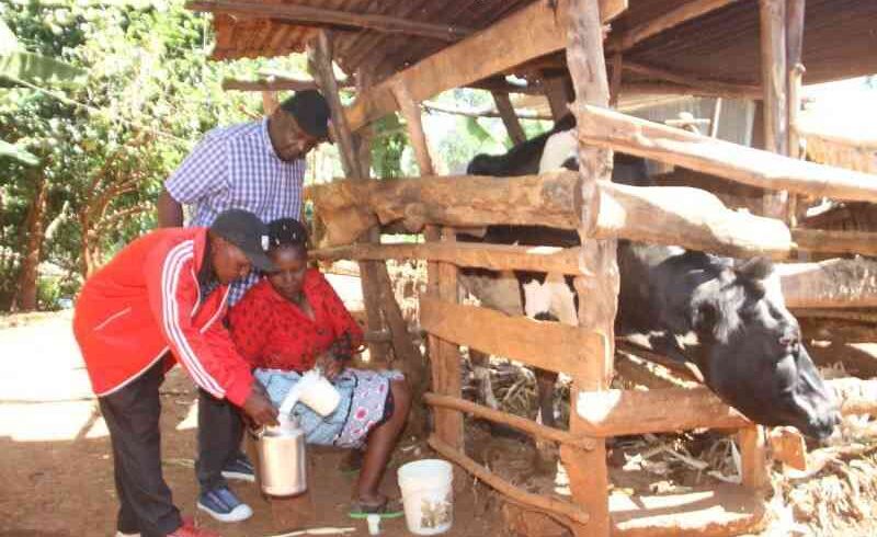 Ahadi Kenya Trust CEO Stanley Kamau watch as a Jigger survivors couple Peter Ngugi and his wife Alice Wairimu milk their cow, when he visited ten families in Gaichanjiru village Kandara sub-County that his organization empowered with Dairy cow. [Boniface Gikandi/Standard]