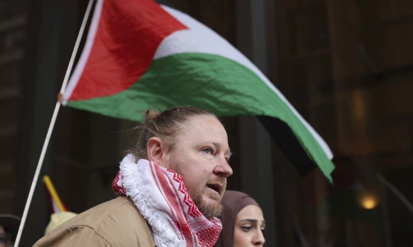 Josh Lees speaks to reporters outside the supreme court after winning the right to march across Sydney Harbour Bridge in support of Palestine tomorrow. (Max Mason-Hubers)