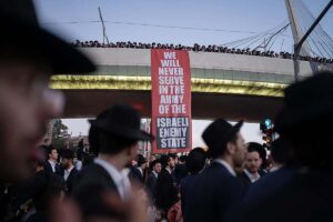 Families and supporters of Israelis held hostage in Gaza since October 2023, hold a protest calling for action to secure their release outside the prime minister’s office in Jerusalem on July 31, 2025. (Menahem KAHANA / AFP)