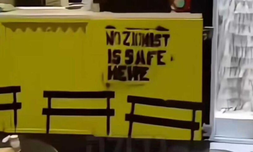 “It is revolting that the ambassador concentrates on graffiti (that is clearly wiped off) while an unprecedented genocide is taking place in Gaza,” Doukas added.