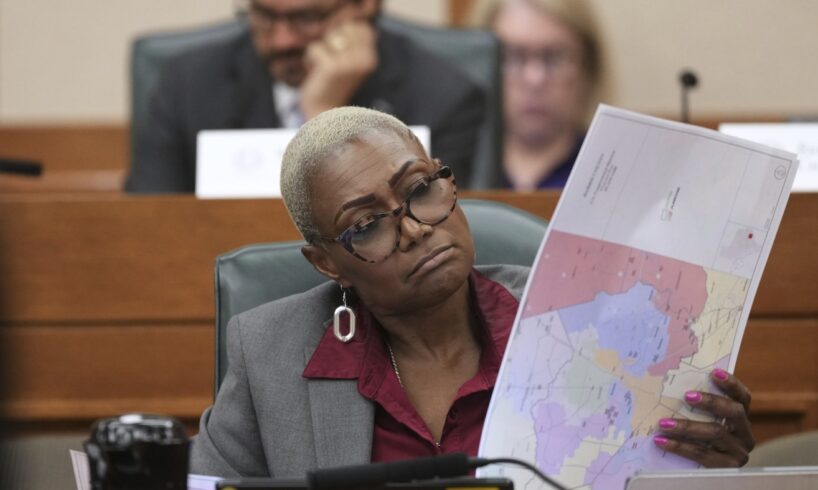 Texas state Rep. Jolanda “Jo” Jones, a Democrat, flips through maps during a public hearing on congressional redistricting in Austin, Texas, Friday, Aug. 1, 2025. After the bill passed the committee, state Democrats fled to Illinois and New York to break the quorum and stall a vote on the new maps, which heavily favor Republicans.