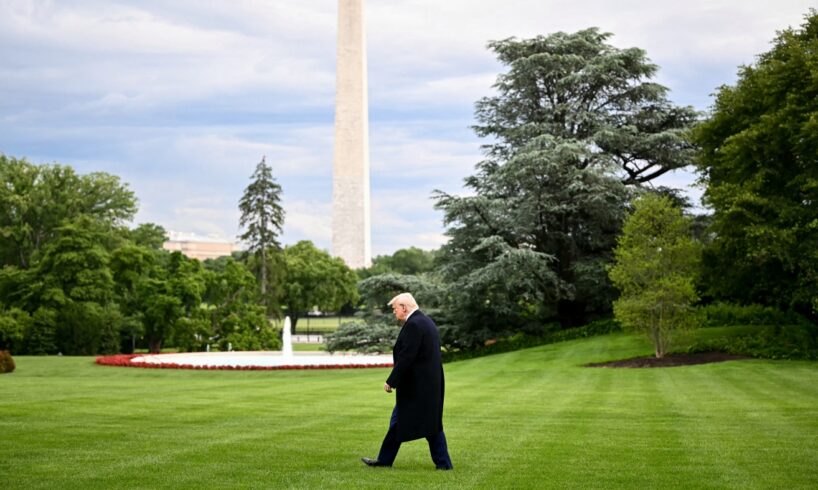 President Donald Trump is pictured walking to Marine One to depart the White House in May, with the Washington Monument in the background.