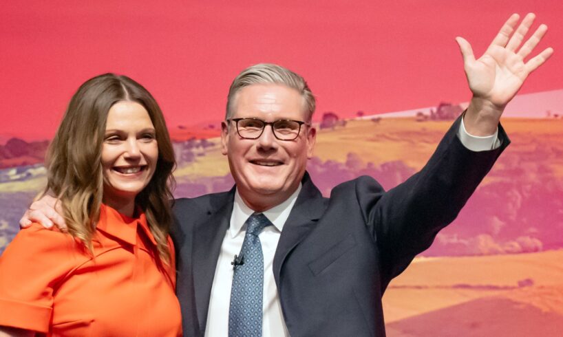 Sir Keir Starmer on stage with his wife Lady Victoria. Pic: PA