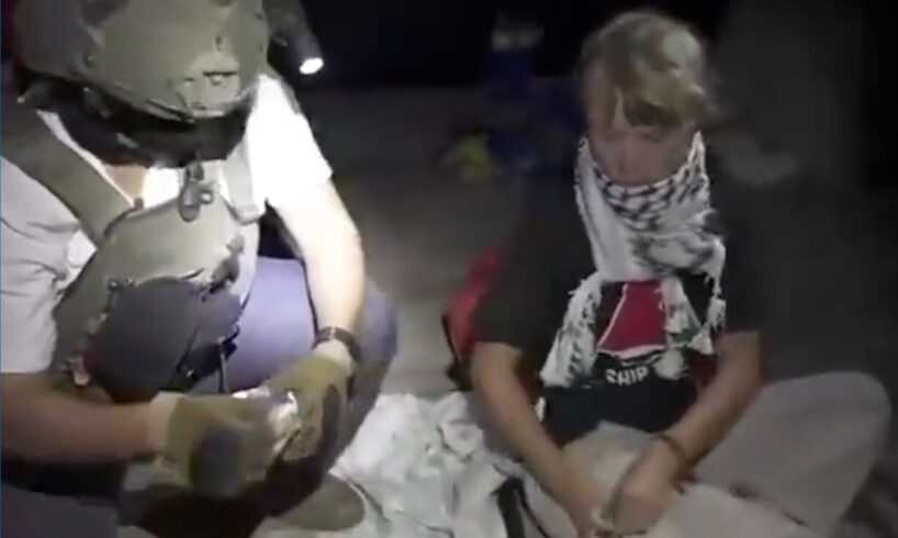 An Israeli soldier detains Swedish campaigner Greta Thunberg aboard a ship in the Global Sumud Flotilla of anti-Israel activists, in video released by the Foreign Ministry on October 1, 2025. (X screenshot)
