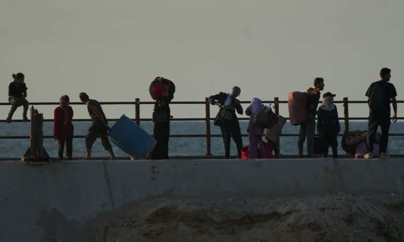 Displaced Palestinians flee northern Gaza carrying their belongings along the coastal road near Wadi Gaza, Thursday, Oct. 2, 2025.
