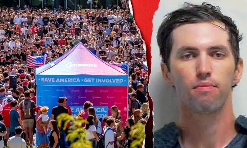 A crowd watches as Charlie Kirk appears at Utah Valley University on Sept.10, 2025, in Orem, Utah. Booking photos for Tyler Robinson, 22, the suspect in the Utah assassination of Turning Point USA founder Charlie Kirk. (Trent Nelson/The Salt Lake Tribune/Getty Images and Washington Co. Sheriff’s Office)
