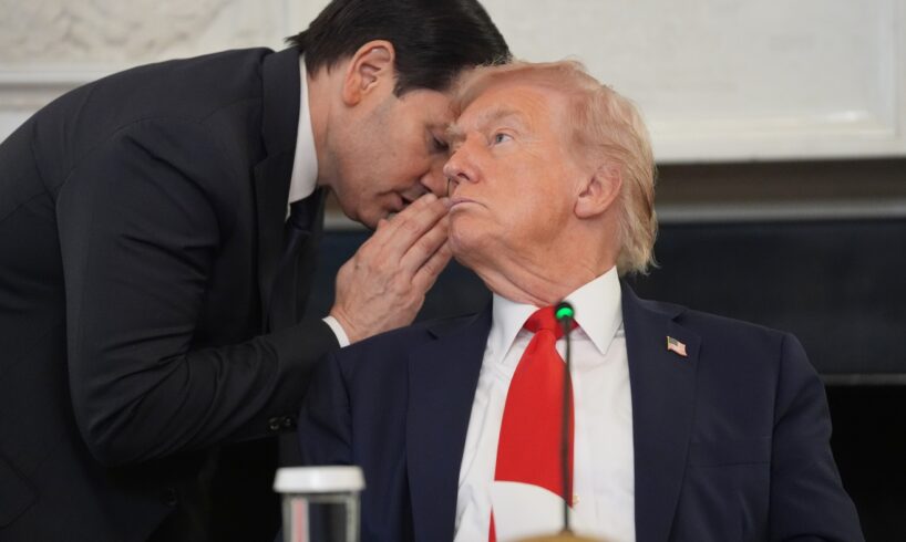 Secretary of State Marco Rubio whispers to President Donald Trump, who is holding the note Rubio handed to him to warn of impending ceasefire deal.