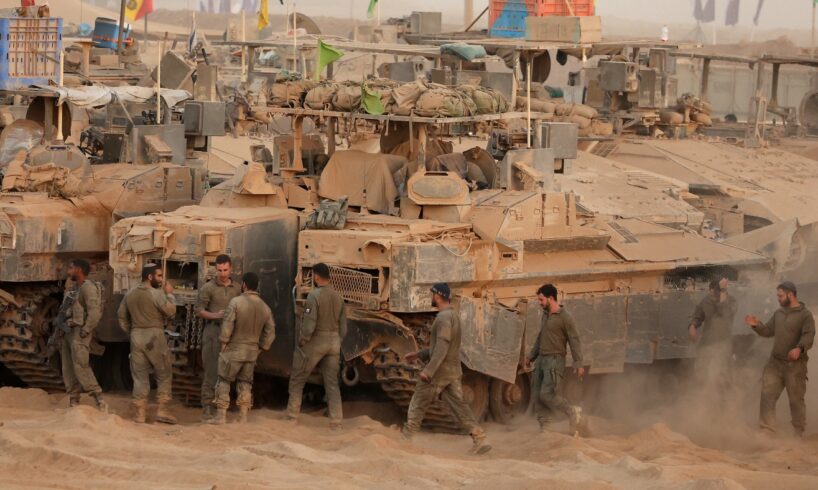Israeli soldiers gather near armoured vehicles at a position along the Israel-Gaza border fence on Oct. 10. Gaza’s civil defence agency said Oct. 10 that Israeli forces have begun pulling back from parts of the territory, particularly in Gaza City and Khan Yunis. Israeli Prime Minister’s office said that the government had “approved the framework” of a hostage release deal with Hamas, as both sides edged closer to ending more than two years of hostilities in Gaza.