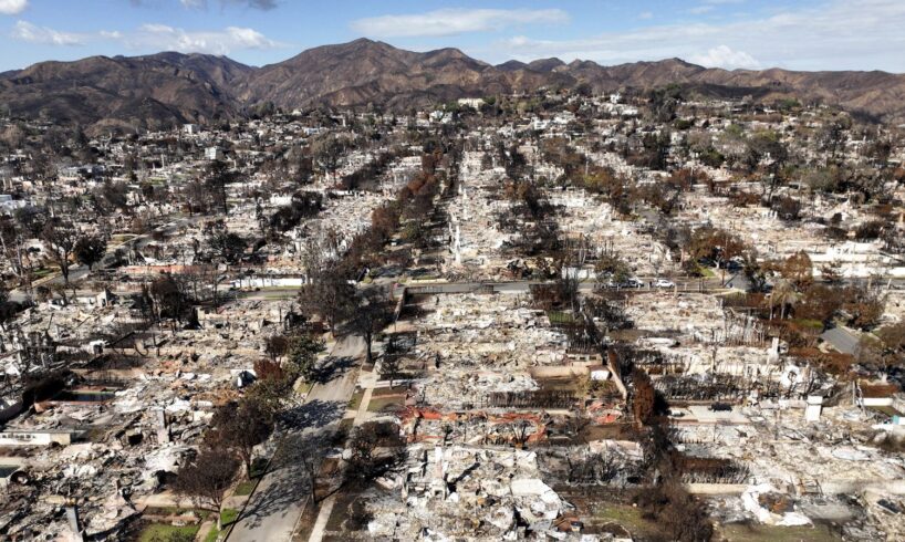 The devastation from the Palisades Fire is shown in an aerial view in the Pacific Palisades neighborhood of Los Angeles, Monday, January 27, 2025. [AP Photo/Jae C. Hong]