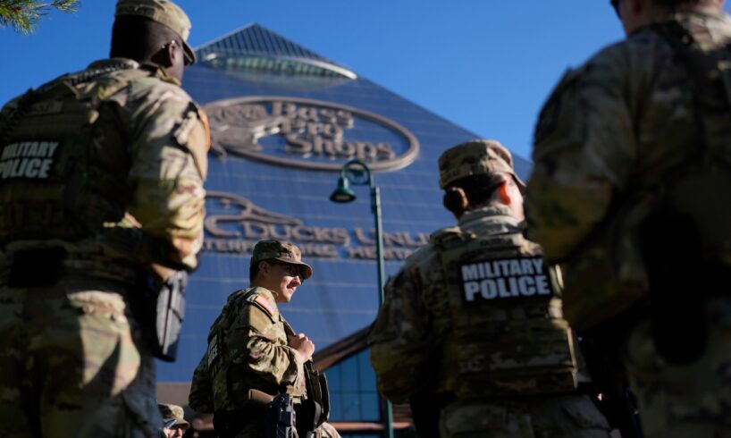 Members of National Guard patrol outside a Bass Pro Shops on Oct. 10 in Memphis, Tenn.