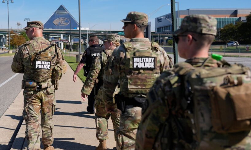 Members of the National Guard patrol along a street in Memphis, Tenn. Friday, Oct. 10, 2025. [AP Photo/George Walker IV]