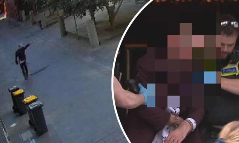 CCTV footage shows a man appearing to point a gun at police as he ran from officers in Melbourne’s CBD this morning after an alleged crime spree.