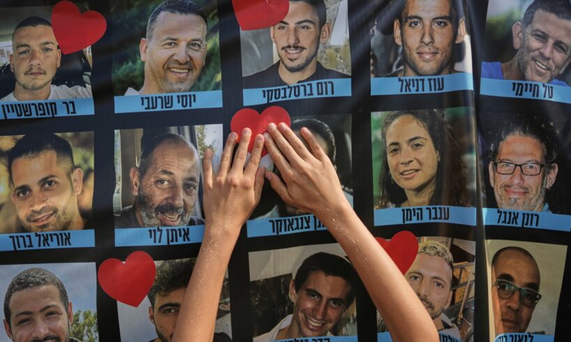 A person pastes a heart-shaped sticker on a banner with pictures of Israeli hostages during a a gathering at a plaza known as hostages square in Tel Aviv, Israel, Monday.