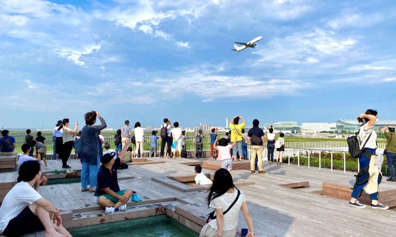 The best-known attraction of HICity is the Footbath Sky Deck. When it opened it quickly went viral on Japanese social media: a rooftop hot-spring-style footbath where you can watch planes taking off and landing just beyond the runways.