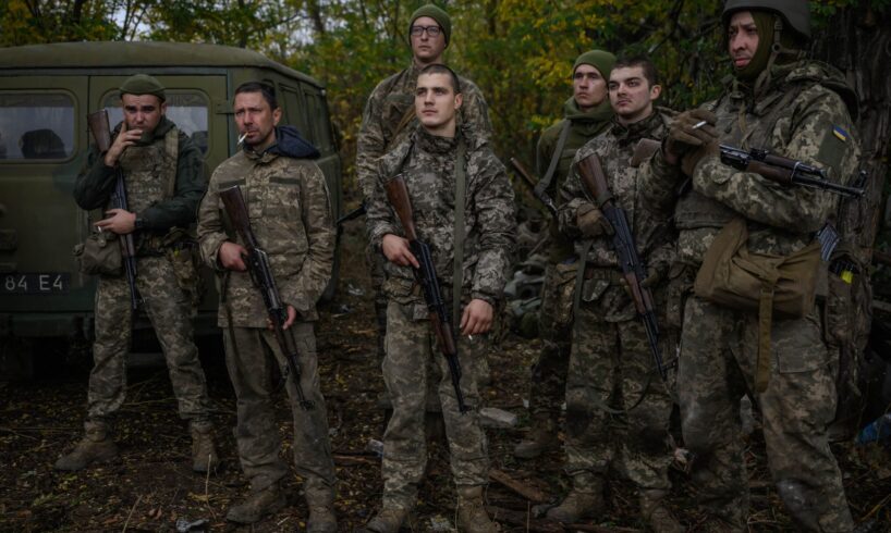 Infantry recruits of the 28th Separate Mechanized Brigade listen to an instructor while undergoing a basic training course at an undisclosed location in eastern Ukraine on Oct. 11, 2025. (Ed Jones / AFP via Getty Images)