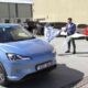A hand holds a paddle against a clear blue sky, preparing to hit a yellow pickleball. The scene suggests a bright and sunny day, with the pickleball clearly in motion.