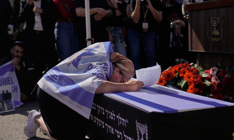 Naomi Baruch grieves over the coffin of her son, Uriel Baruch, a slain hostage whose body was returned from Gaza as part of a ceasefire agreement between Israel and Hamas, in Jerusalem, Sunday, Octover 19, 2025. (AP)