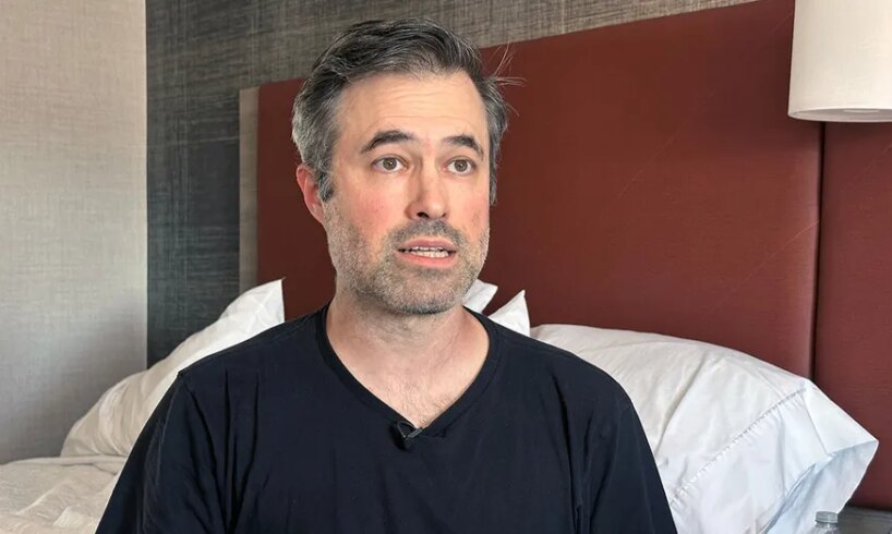 Mark Bray, a Rutgers assistant professor of history, waits in a hotel room in Newark, N.J., before a planned flight to Spain on Thursday, Oct. 9, 2025. (AP Photo/Ted Shaffrey)