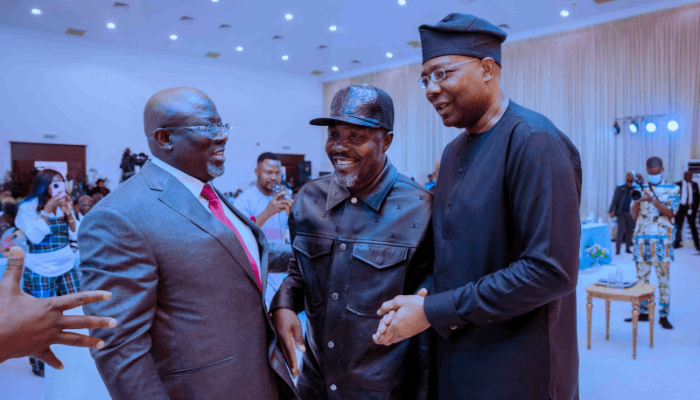 Gov Sheriff Oborevwori of Delta State (left) exchanging pleasantries with Government Ekpomupolo, the Chairman of Tantita Security Services Ltd (Middle), while Aigboje AIG-Imoukhuede, Chairman of the occasion and Group Chairman Access Holdings PLC, (right) looks on.