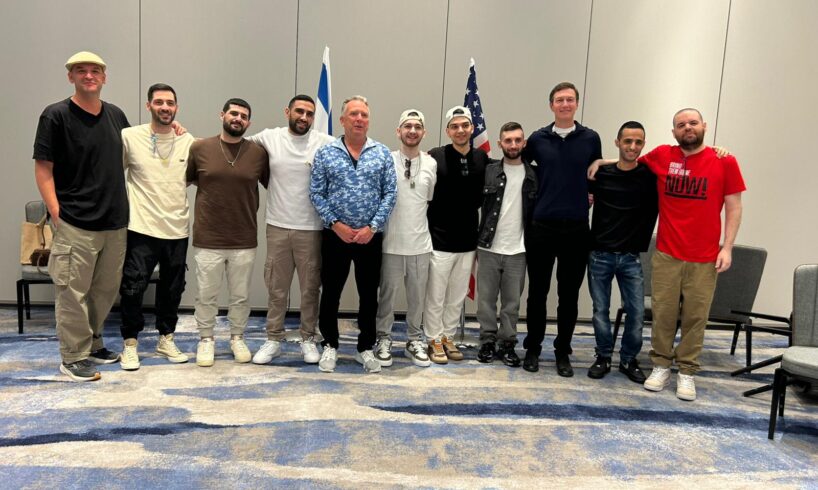US envoy Steve Witkoff and Jared Kushner meet with released hostages Omri Miran, Gal Berman, Ziv Berman, Yosef Chaim Ohana, Matan Angrest, Bar Kuperstein, Segev Kalfon, Nimrod Cohen, and Eitan Horn in Tel Aviv, October 21, 2025. (Hostages and Missing Families Forum)