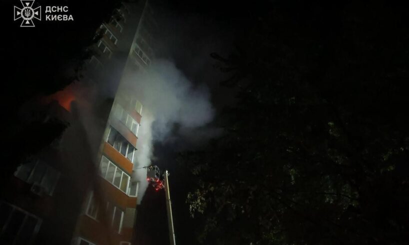 A fire broke out in a high-rise building on the 8th and 9th floors in Kyiv’s Dniprovskyi district as a result of the drone attack, according to Tymur Tkachenko, head of the Kyiv City Military Administration.