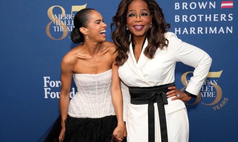 Misty Copeland, left, and Oprah Winfrey attend the American Ballet Theatre’s Fall Gala honoring Misty Copeland at David Geffen Hall on Wednesday, Oct. 22, 2025, in New York.
