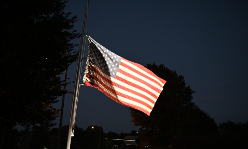U.S. flags fly at half staff following the assassination of conservative commentator Charlie Kirk at Utah Valley University on Sept. 10 in Chicago.